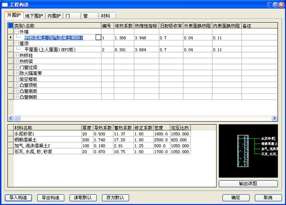 開放的基礎(chǔ)構(gòu)造庫、材料庫,可以隨時(shí)將新的節(jié)能材料加入到材料庫,方便新型節(jié)能材料的推廣和應(yīng)用。構(gòu)造材料的導(dǎo)熱系數(shù)及厚度智能聯(lián)動(dòng),自動(dòng)輸出構(gòu)造做法節(jié)能詳圖。