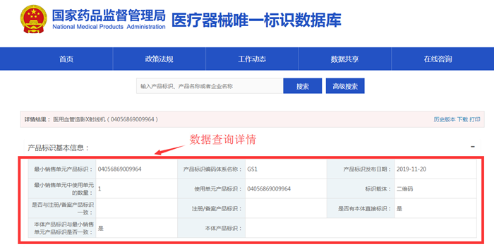 為方便社會公眾查詢,醫療器械唯一標識數據庫首頁設置了查詢功能和高級查詢(圖1所示),滿足用戶多條件、多角度的查詢要求。數據查詢詳情按產品標識不同特點展示(圖2所示),同時設置了查詢數據的折疊或展開、下載、打印、歷史版本記錄等輔助功能,滿足用戶多樣化需求。