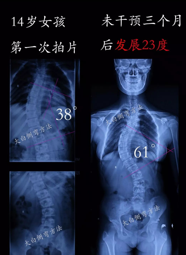 我們看到很多脊柱側(cè)彎發(fā)展的情況,例如:7天發(fā)展5度,3個月發(fā)展23度,5個月發(fā)展15度,3個月發(fā)展5度等。